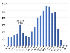 それ以外に特徴的なのは、20歳から24歳の所に顕著なピークが存在する事である。実はこれは大学生なのである。一般的に日本では高校生まではご両親と一緒に暮らしている方がほとんどと思われる。そして大学を卒業後は初任給も入る事から、学生時代よりは少しは良いアパート等に住む事になる。