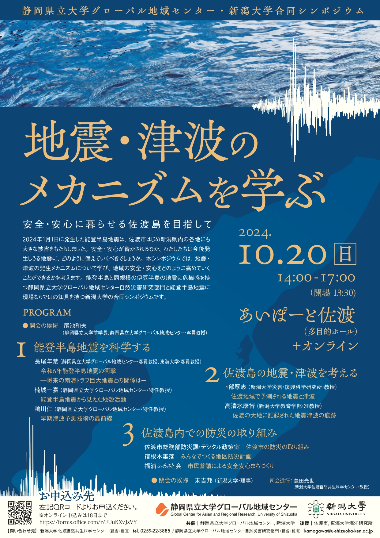 2024年1月1日に発生した能登半島地震は、佐渡市はじめ新潟県内の各地にも大きな被害をもたらしました。安全・安心が脅かされるなか、わたしたちは今後発生しうる地震に、どのように備えていくべきでしょうか。本シンポジウムでは、地震・津波の発生メカニズムについて学び、地域の安全・安心をどのように高めていくことができるかを考えます。能登半島と同規模の伊豆半島の地震に危機感を持つ静岡県立大学グローバル地域センター自然災害部門と能登半島地震に現場ならではの知見を持つ新潟大学の合同シンポジウムです。